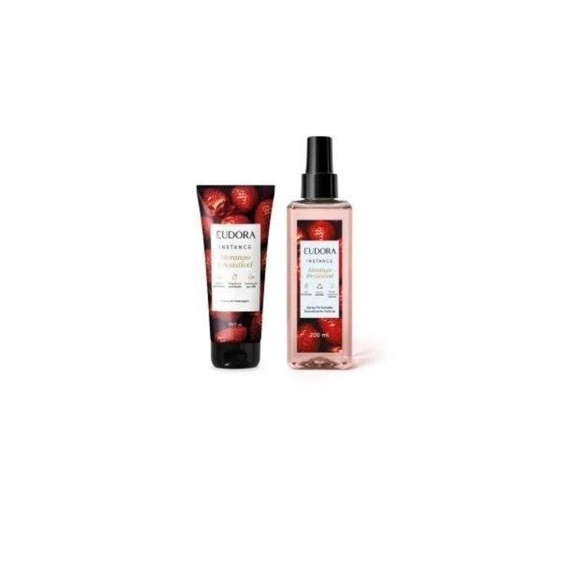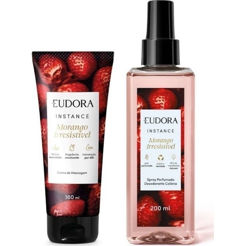 Combo Instance Morango Irresistível: Spray Perfumado 200ml + Creme de Massagem 180g Eudora Este combo reúne o melhor da linha Instance Morango Irresistível para uma experiência completa de cuidado e celebração! O Spray Perfumado Desodorante Colônia 200ml proporciona uma fragrância envolvente, o Creme de Massagem 180ml garante hidratação intensa.
