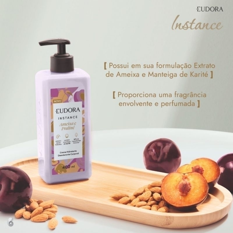 Creme Hidratante Desodorante Corporal Instance Ameixa e Praliné 400ml Eudora Instance traz para a sua rotina de cuidados básicos o Creme Hidratante Desodorante Corporal Instance Ameixa e Praliné, unindo hidratação com uma fragrância envolvente. Este hidratante de ameixa deixa a pele hidratada com secagem rápida para trazer mais praticidade à sua rotina de cuidados. Com fórmula vegana e ingredientes com 97% de origem natural, a fragrância combina suculência da Ameixa com a indulgência gustativa do Praliné, criando uma explosão de cremosidade e cuidado para sua pele em uma fragrância floriental envolvente e fascinante.