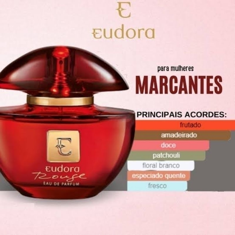 Eudora Rouge Eau de Parfum 75ml Eudora Rouge Eau de Parfum foi criado de forma exclusiva para mulheres de atitude, que provocam reações ao passar e permanecem na memória daqueles que cruzam o seu caminho. Com inspiração no poder e na confiança que o vermelho desperta, Eudora criou um EDP elegante e que marca presença. A essência marcante de Eudora Rouge combina as notas suculentas da Maçã Vermelha e Ameixa com a personalidade da Flor de Jasmim. A intensidade das notas amadeiradas de Patchouli e o Segredo de Eudora tornam esta fragrância feminina ainda mais inesquecível. Família Olfativa: Chypre Floral