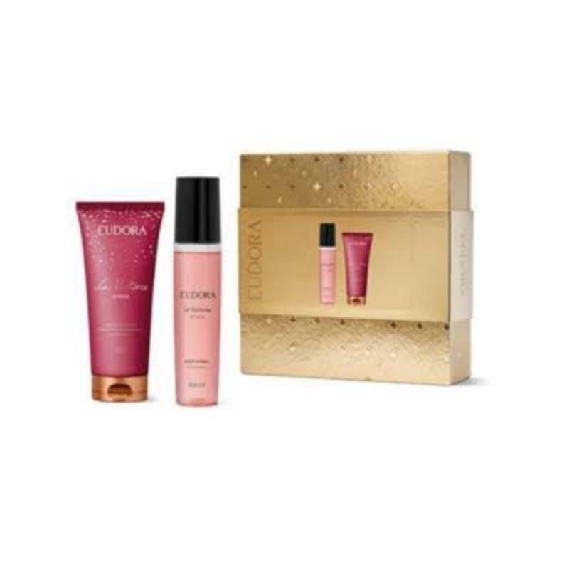 Kit Presente La Victorie Intense: Intense Body Spray Desodorante 100ml + Creme Acetinado Hidratante Desodorante Corporal 200g Proporcione uma experiência completa de perfumação e cuidado com o Kit La Victorie Intense! O Body Spray garante proteção contra odores da transpiração e perfumação leve e refrescante, enquanto o Creme Acetinado Hidratante Desodorante Corporal oferece hidratação intensa por até 48 horas. Um presente para mulheres que apreciam se sentir confiantes e perfumadas ao longo do dia. BODY SPRAY O Body Spray La Victorie Intense é um desodorante corporal que protege a pele contra os maus odores causados pela transpiração. Sua fórmula combina proteção contra odores da transpiração, frescor prolongado e exclusiva perfumação leve, inspirada na sua fragrância favorita da perfumaria Eudora. CREME ACETINADO HIDRATANTE DESODORANTE O Creme Acetinado Hidratante Desodorante Corporal La Victorie Intense traz uma hidratação intensiva e perfumada para você aproveitar cada instante da sua jornada. Com textura cremosa, esta loção corporal proporciona toque acetinado na pele e hidratação intensiva por até 48h. Além de hidratar, a loção corporal também desodoriza e perfuma a pele ao longo do dia com a mesma fragrância Floral Amadeirada de La Victorie Eau de Parfum.