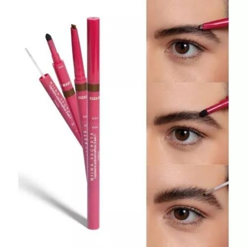 Lapiseira de Sobrancelha 3 em 1 Clara Niina Secrets 1,1g Idealizada para quem ama praticidade sem abrir mão de beleza e sofisticação, a Lapiseira de Sobrancelha 3 em 1 Clara Niina Secrets preenche, define e fixa a sobrancelha. De fácil aplicação com acabamento natural, essa lapiseira de sobrancelha dispõe de: 1.Ponta triangular para desenho de fios fininhos e naturais; 2.Esponja cushion para preenchimento total da sobrancelha; 3.Escovinha + Gel Fixador para deixar todos os fios no lugar.
