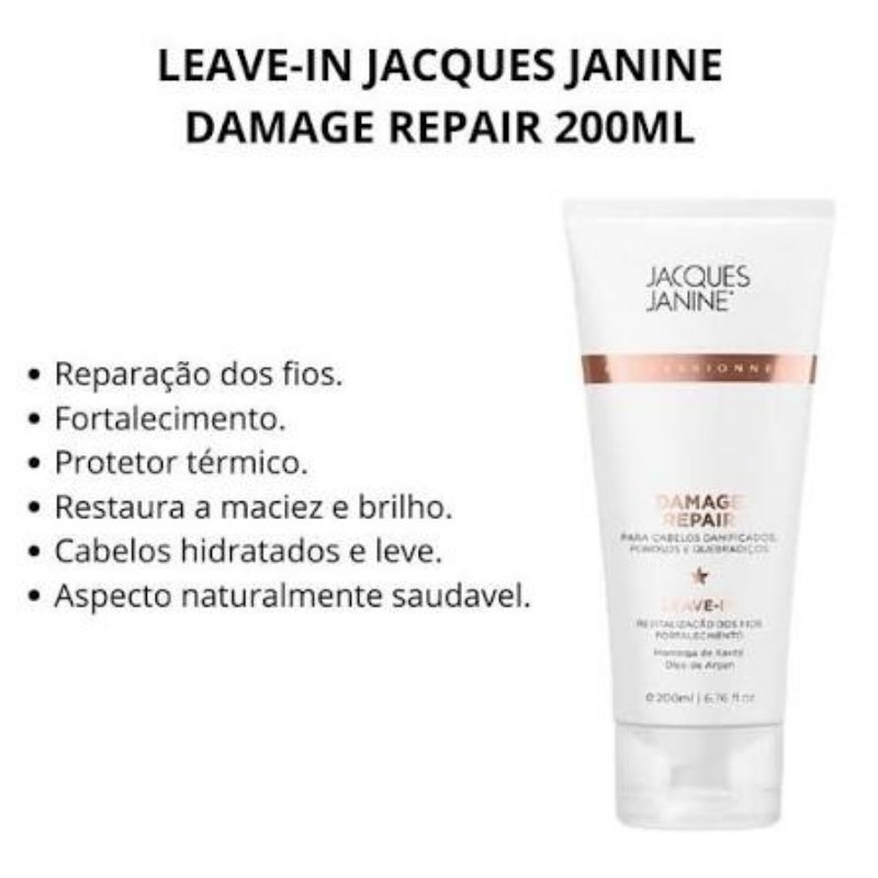Jacques Janine Professionnel Damage Repair Leave-in para cabelos danificados, porosos e quebradiços. Jacques Janine Professionnel Damage Repair ajuda a proteger os seus fios da exposição a ferramentas de calor, como secador e prancha, além dos efeitos do tempo. O Leave-in Jacques Janine Professionnel Damage Repair traz fórmula enriquecida com ManteOS Manteiga De Karité, Proteína Do Trigo, Óleo De Argan e Ceramidas, para garantir fios mais macios, alinhados e brilhantes. Além disso, trata e revitaliza, auxiliando na secagem dos cabelos e entregando brilho tridimensional à fibra capilar.