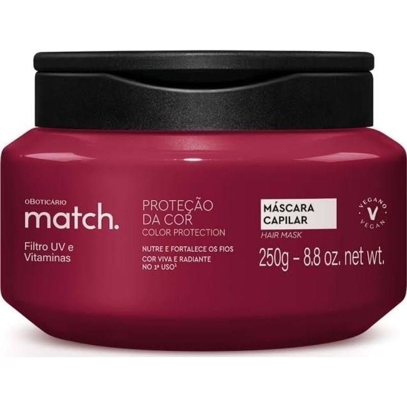 o Boticário Match. Proteção da Cor Máscara para cabelos coloridos. o Boticário Match. Proteção da Cor nutre, fortalece e promove cor vibrante aos fios, além de prevenir o desbotamento. A Máscara Capilar o Boticário Match. Proteção da Cor é o tratamento ideal para cuidar dos cabelos tingidos e garantir cor viva no primeiro uso. Proporcona nutrição profunda, fios hidratados imediatamente com brilho intenso, e ainda garante cor prolongada e mais radiante por até 40 dias*. Conta com fragrância Oriental Especiada que deixa o cabelo super cheiroso.