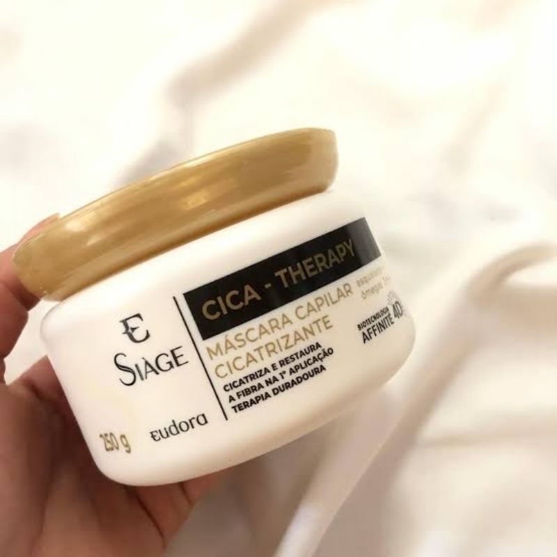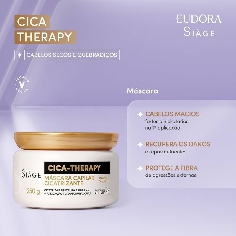 Eudora Siàge Cica Therapy Cabelos com pontas duplas ou danificados? A Máscara Capilar Eudora Siàge Cica Therapy recupera a saúde dos seus fios de forma profunda e duradoura. Com a tecnologia Affinité 4D, a máscara capilar age imediatamente, reparando danos e repondo nutrientes essenciais. A fórmula é enriquecida com os ativos Esqualano e Ômegas 3 e 6, que devolvem a saúde interior dos fios e os protegem contra agressões diárias. Por que essa máscara capilar é ideal para recuperação dos fios? Age diretamente nas áreas danificadas já na 1ª aplicação* Garante 90% menos quebra e atua de dentro para fora. Restaura e protege a fibra capilar contra danos futuros.