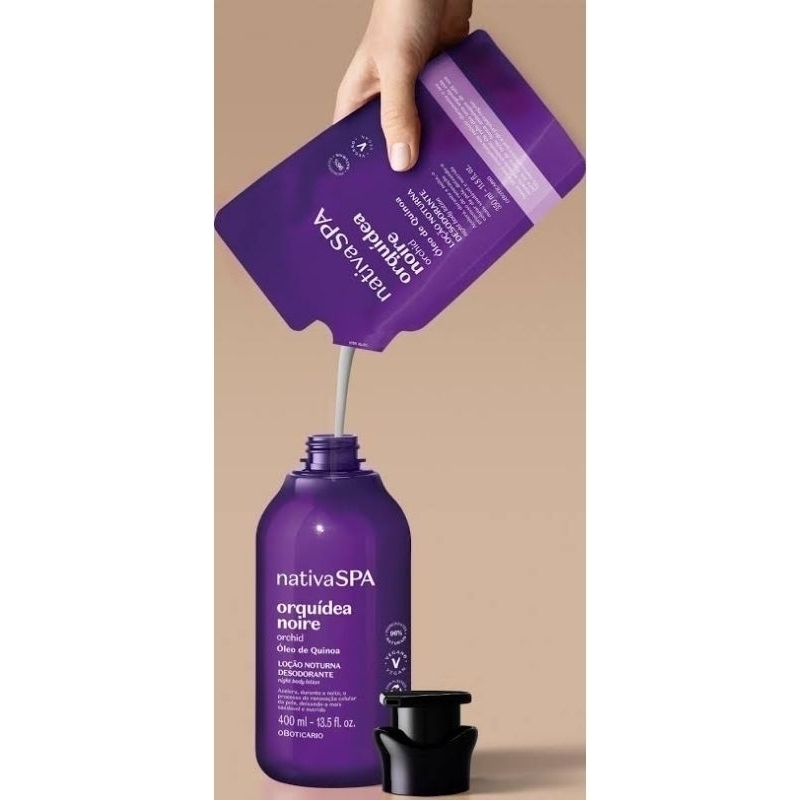 Refil Loção Noturna Desodorante Corporal Nativa SPA Orquídea Noire 350ml Com o Refil Loção Hidratante Desodorante Corporal Nativa Spa Orquídea Noire você não precisa interromper o seu ritual noturno de beleza e sensualidade e garantir sempre uma pele hidratada, fragrância marcante e explosão de sensualidade, em um tratamento poderoso que atua na pele enquanto você dorme. O segredo da fragrância está em toda a sensualidade que a Orquídea Noire carrega, uma flor icônica que traz o mistério da noite e entrega uma fragrância floral amadeirada, exótica e sensual, que dura a noite inteira para a pele acordar perfumada. Com 96% de ingredientes naturais, conta também com Óleo de Quinoa, que acelera a renovação celular da pele durante a noite e estimula a produção natural de colágeno.