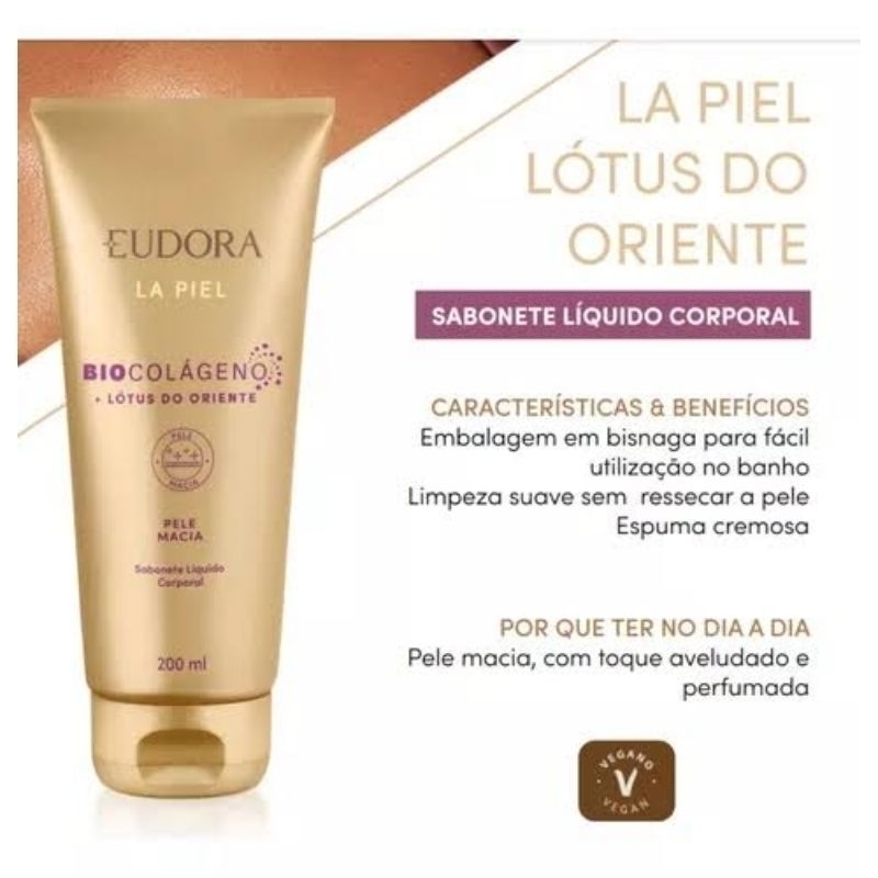 Sabonete Líquido Corporal La Piel Lótus do Oriente 200ml Você não precisa escolher entre tratamento ou perfumação da pele: o Sabonete Líquido Corporal La Piel Lótus do Oriente combina os dois, além de ter uma fragrância Oriental Floral maravilhosa. Ele tem uma espuma cremosa que deixa a pele refrescante, macia e perfumada , limpando-a suavemente, sem ressecar. Dermatologicamente testado Produto vegano.